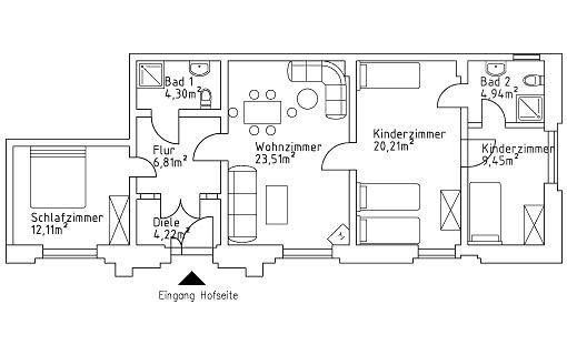 Der Fuchsbau ist eine Erdgeschoss-Wohnung mit ca. 100 qm für 6 Personen im alten Verwalterhaus.