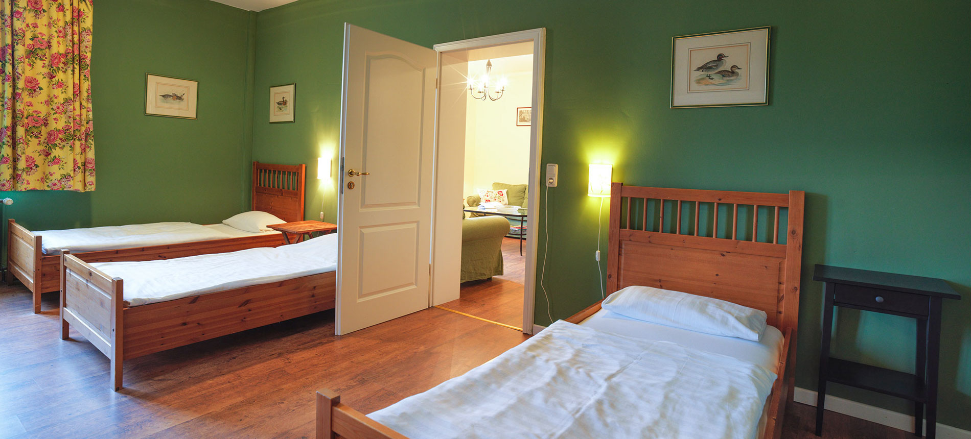 Der Fuchsbau verfügt über ein Doppelzimmer, ein Zimmer mit drei Einzelbetten und ein Einzelzimmer. Zwei Badezimmer mit Dusche, eine Wohnküche (Spülmaschine), TV, W-LAN und einem separaten Eingang. Diese Wohnung ist sehr zentral gelegen. Auf der Rasenfläche vor dem Eingang können Sie Gartenmöbel und Liegen nutzen.