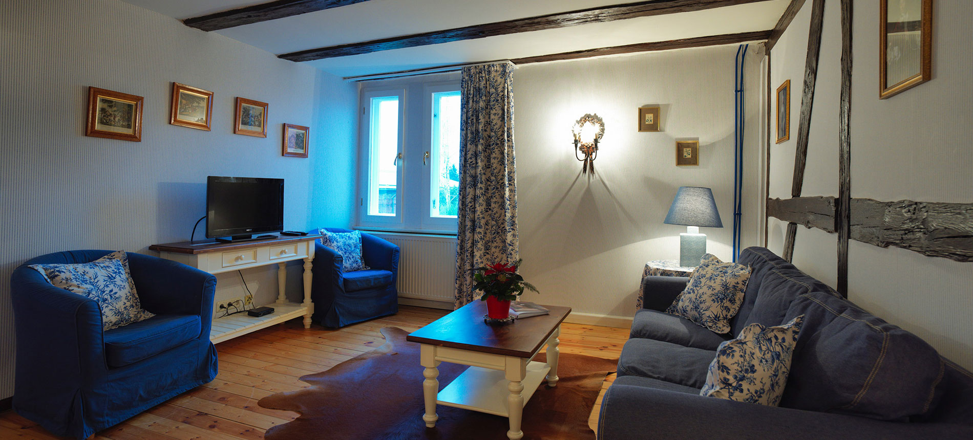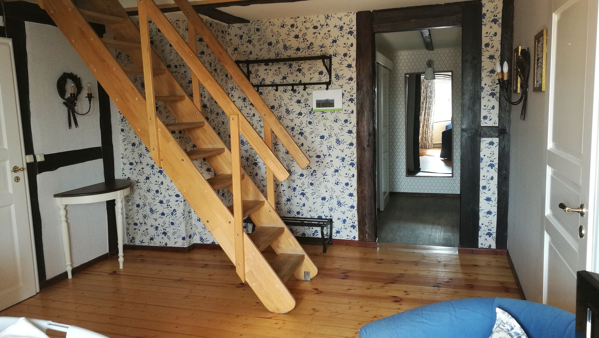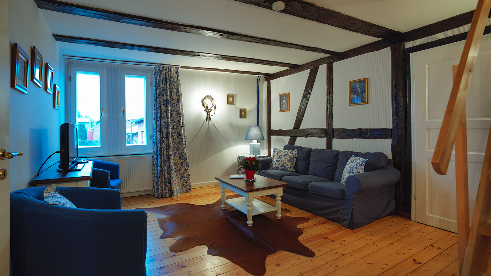 Die Ferienwohnung „Gänsestall“ mit ca. 76 qm befindet sich im alten Verwalterhaus, und bietet Platz für 4 Personen, verteilt auf 2 Etagen.
