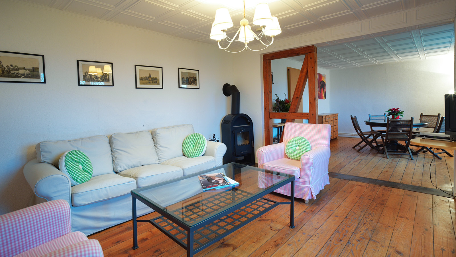Im Erdgeschoss befindet sich das Wohnzimmer mit Kamin und Blick auf einen Teich und die Pferdekoppel, eine gemütliche und große Küche, ein Bad mit Dusche und ein separates WC.