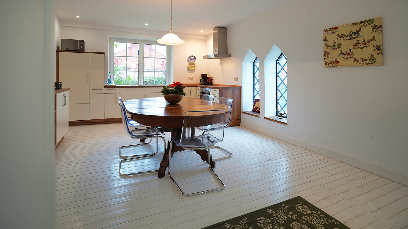 Diese Wohnung hat Zugang zur großen, hellen Tenne mit großem Tisch.