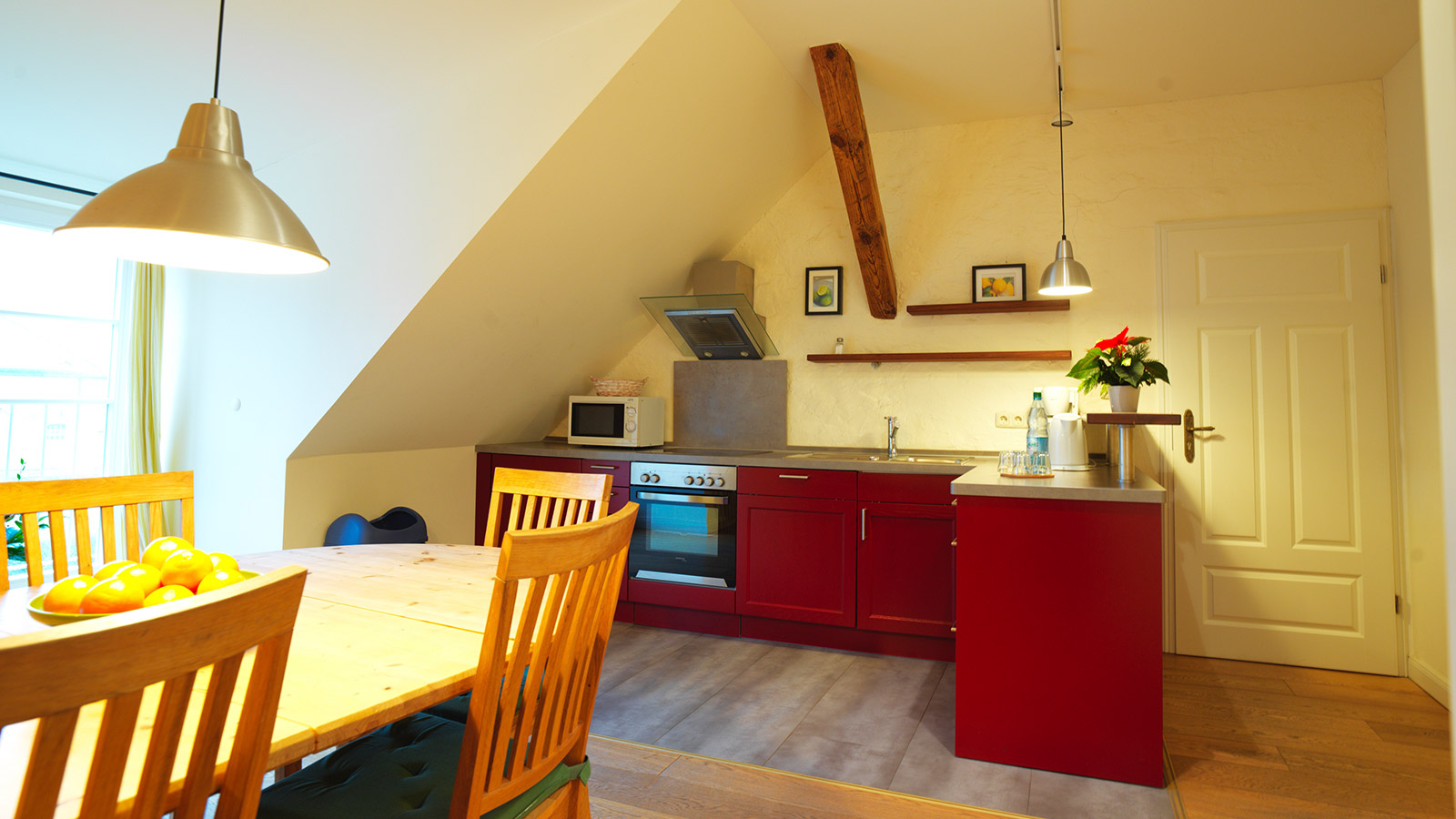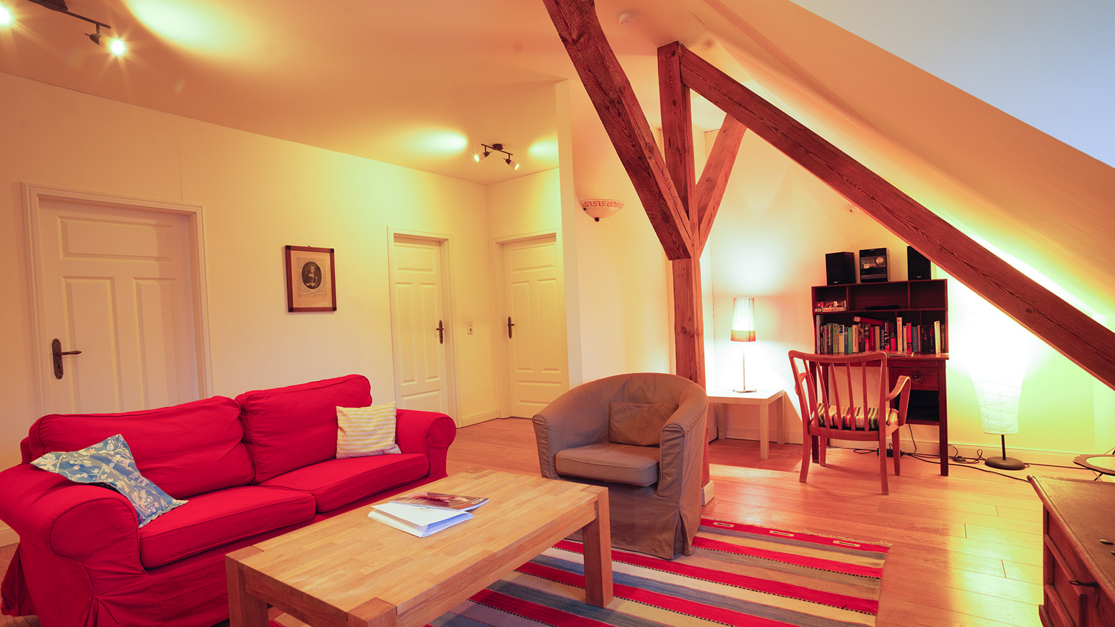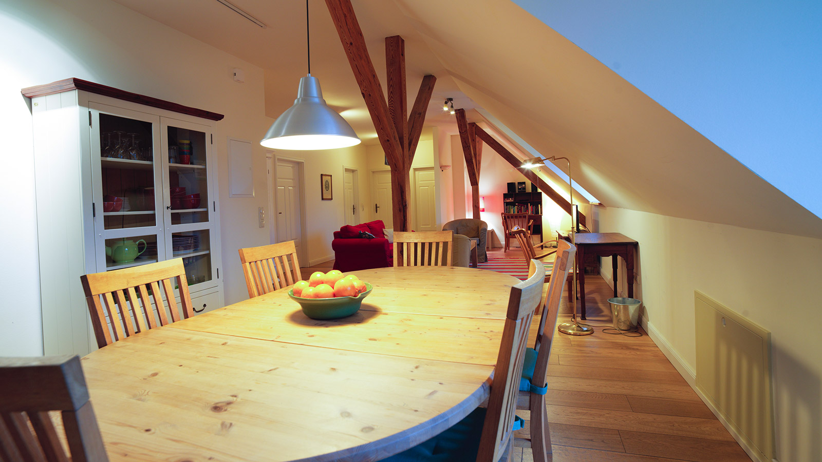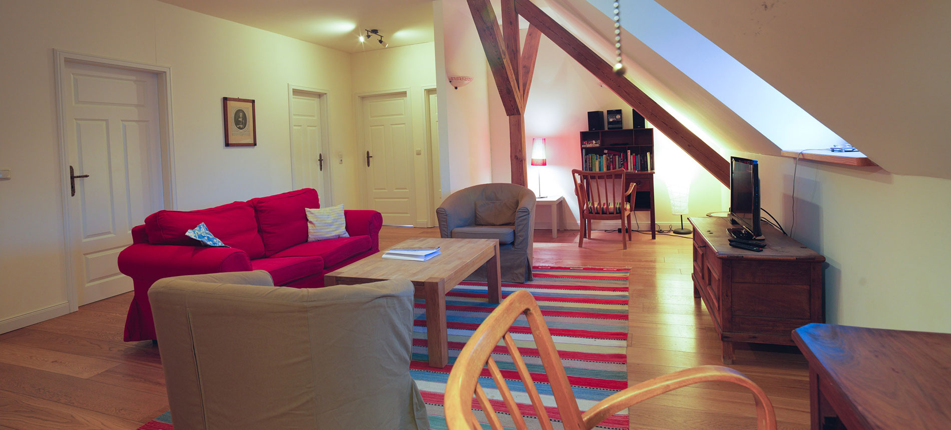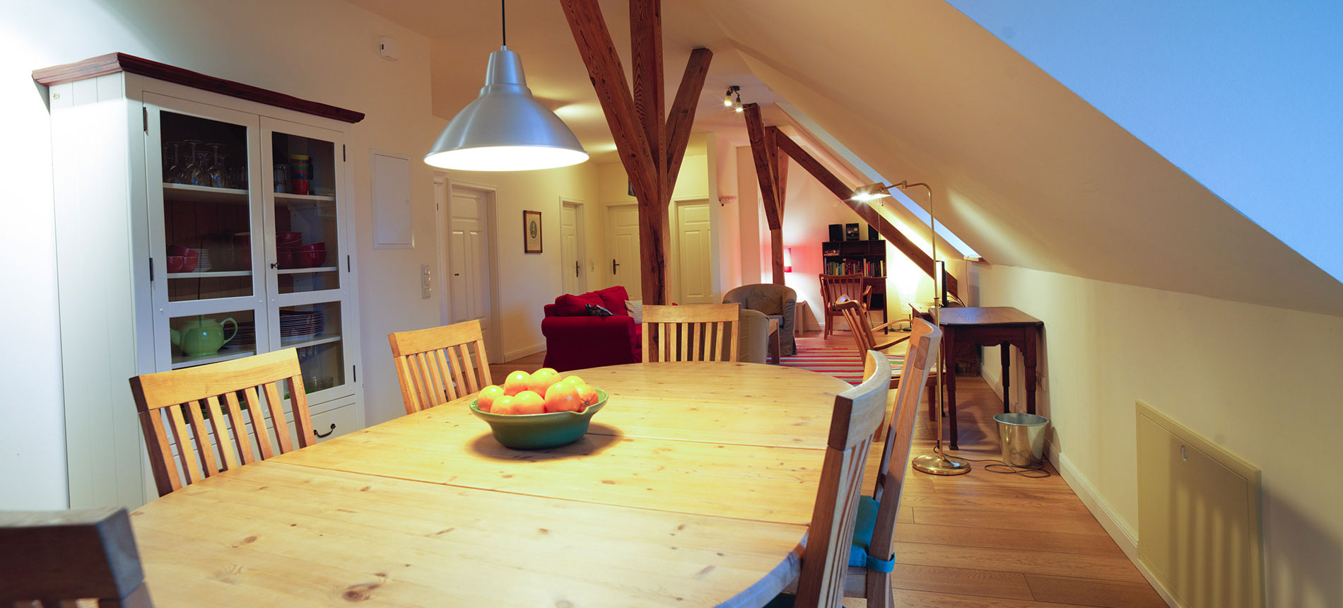 Die Kutscherwohnung im Dachgeschoss der ehemaligen Stellmacherei mit ca. 100 qm ist für 6 Personen komfortabel.