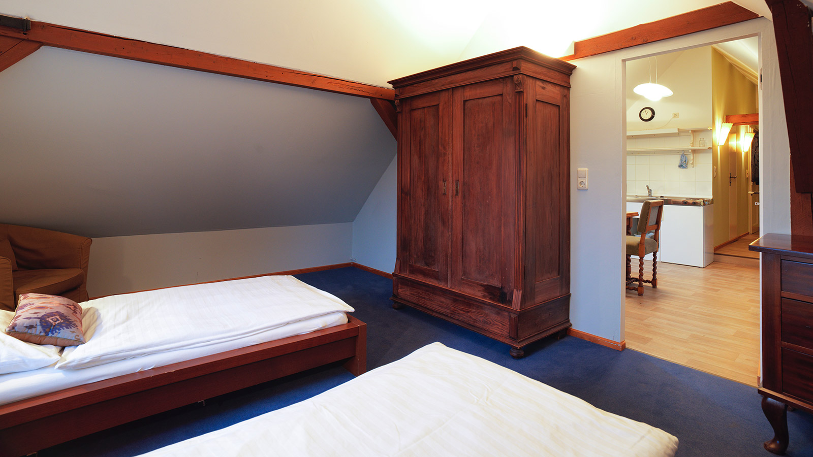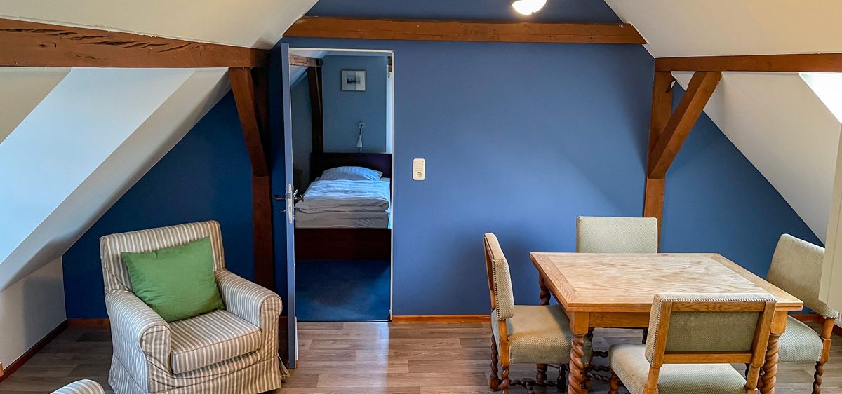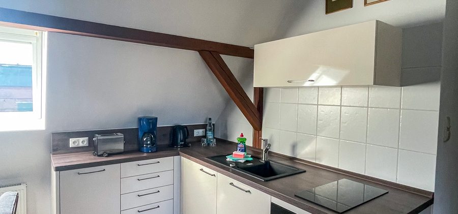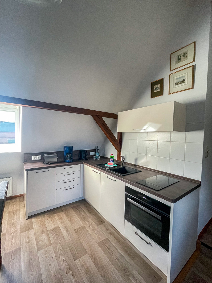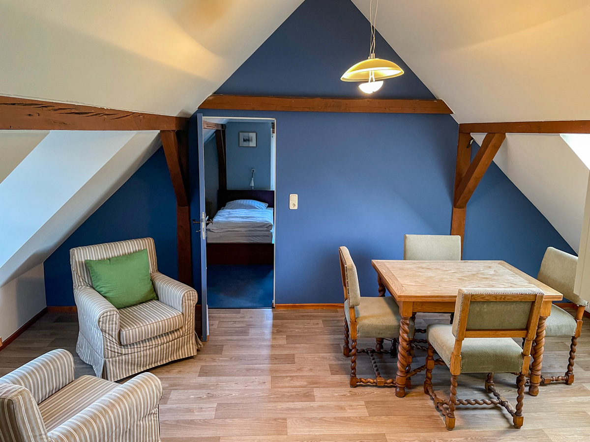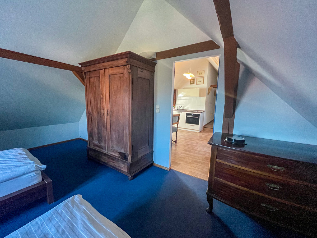 Das Mardernest mit ca. 50 qm, ist eine gemütliche Wohnung mit Dachschrägen. Sie befindet sich in der zweiten Etage neben der Remise und über unseren Büros.