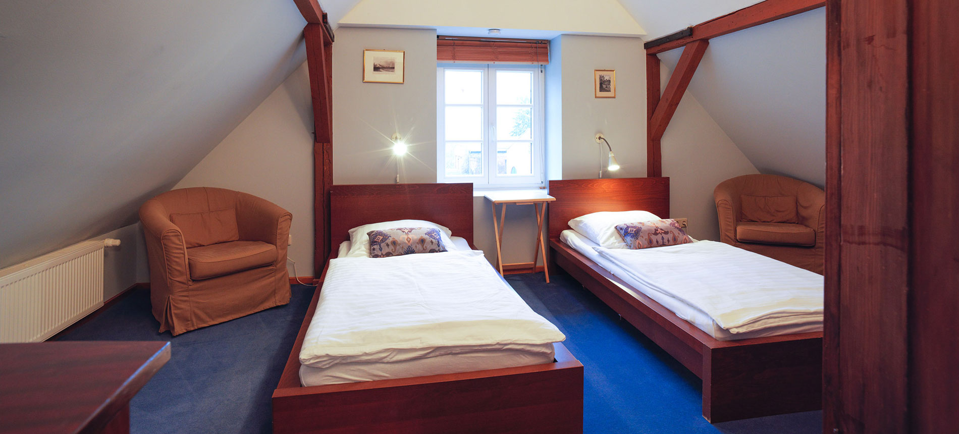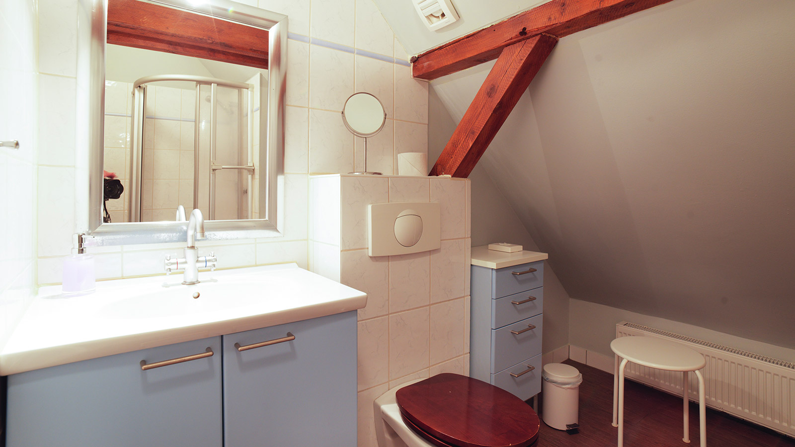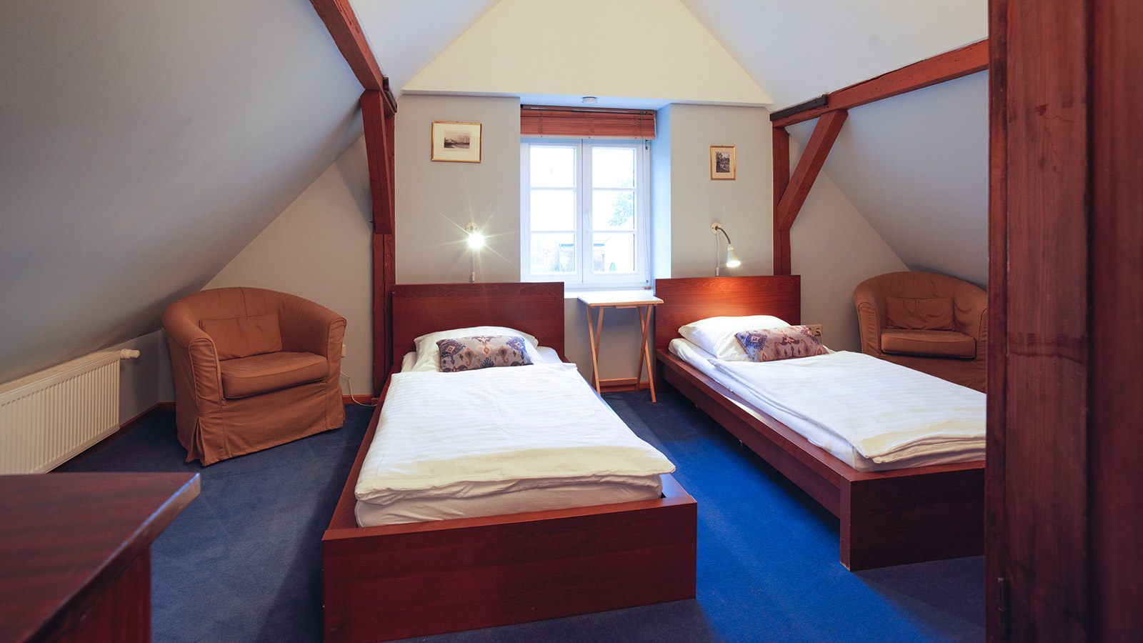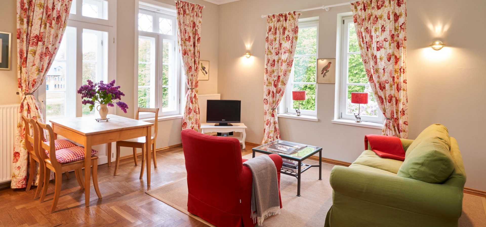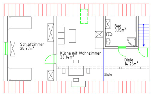 Das Mardernest mit ca. 50 qm, ist eine gemütliche Wohnung mit Dachschrägen. Sie befindet sich in der zweiten Etage neben der Remise und über unseren Büros.