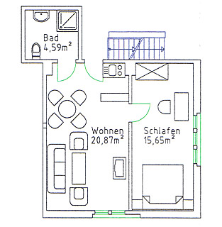 Es hat ein Doppelzimmer, ein Wohnzimmer mit Essbereich und offener Küchenzeile.
