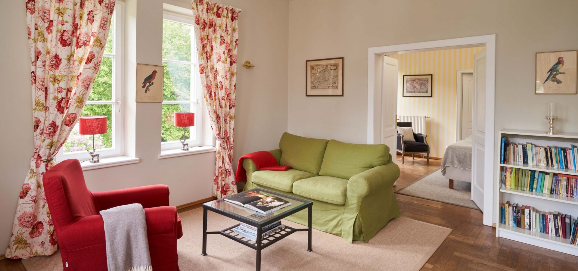 Die Turmwohnung 1 mit ca. 70 qm befindet sich im Obergeschoss des linken Flügels des Gutshauses.