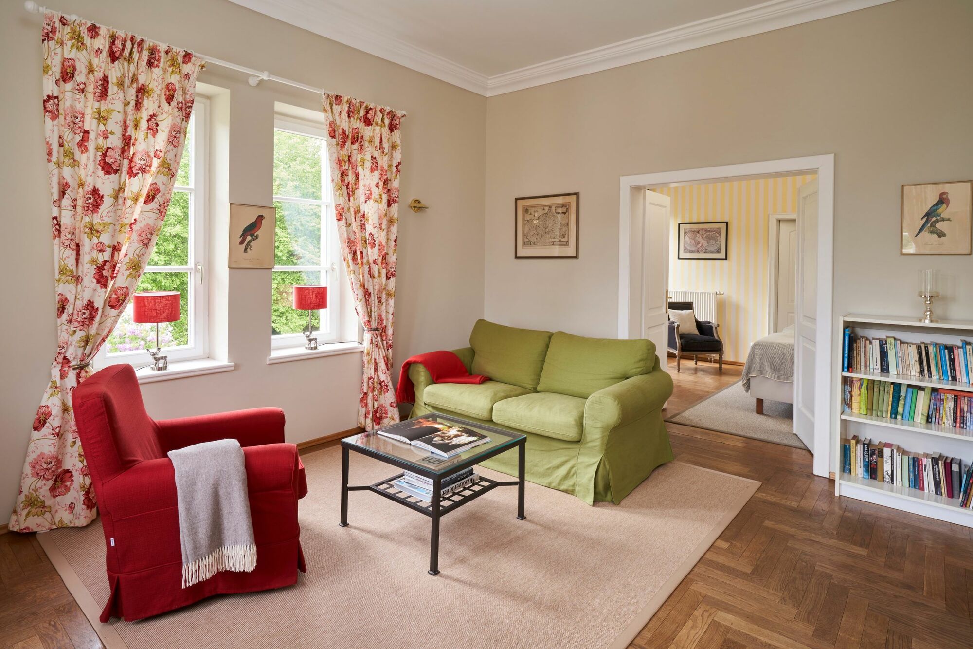 ein Wohnzimmer mit großzügigem Blick über die gesamte Gutsanlage und eine Küche. Wir möchten diese Wohnung als Nichtraucherwohnung behalten.